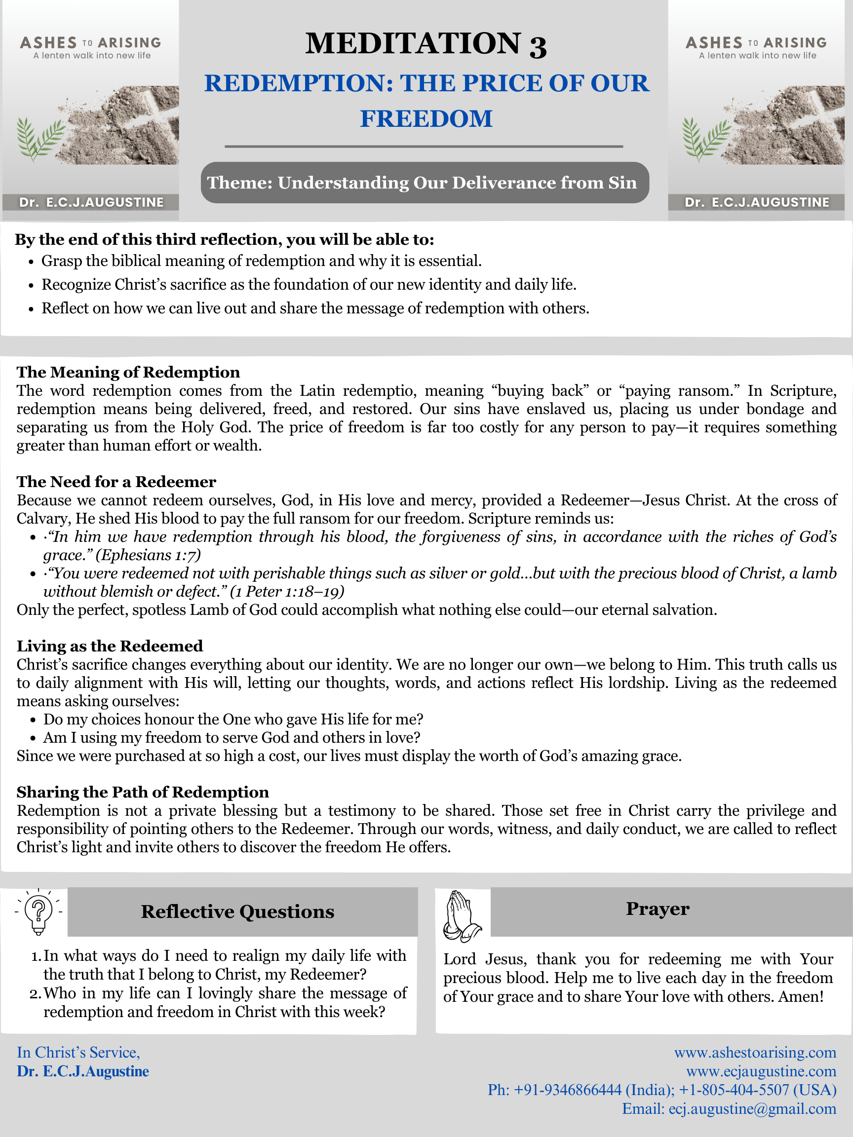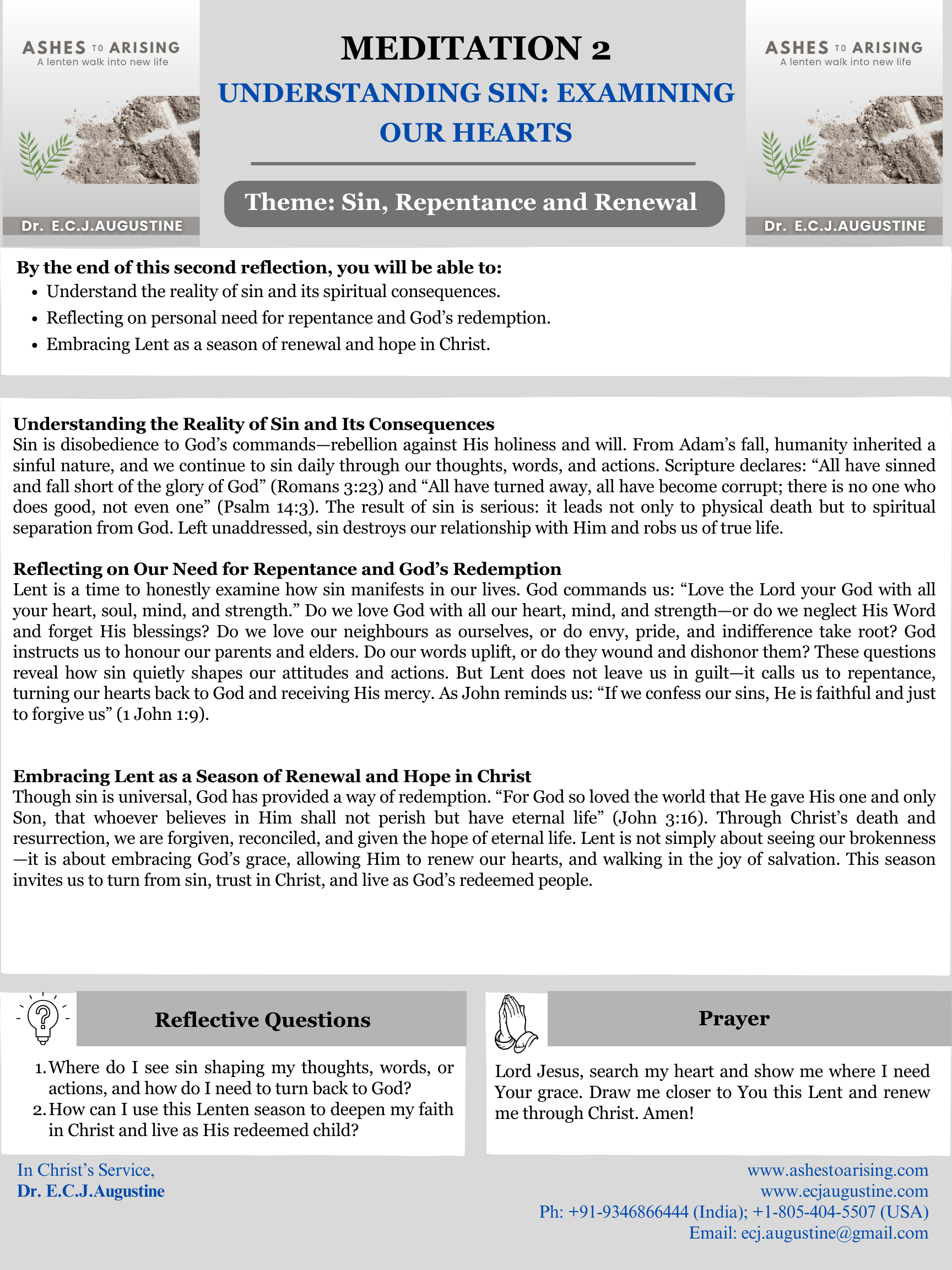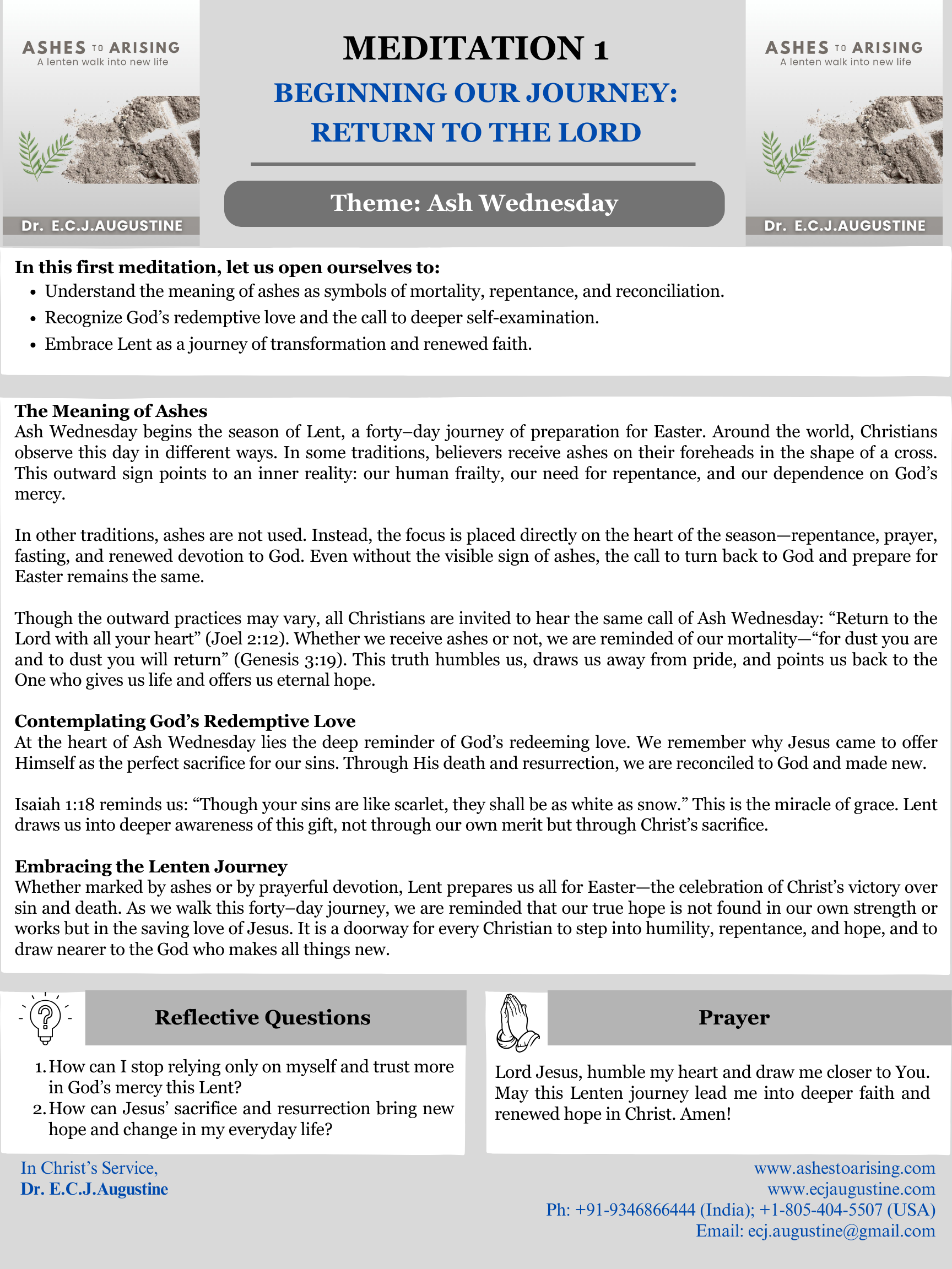 wrote a book on Ashes to Arising: A Lenten walk into New life. I am much humbled and privileged for asking me to write this foreword. “Lent” has been an important place in Christian ecclesiological calendar and a much devotional season of Christian faith. Lent season consists 40 days, which begins every year with Ash Wednesday and ends with the Saturday before Easter, excluding all Sundays. Every year Ash Wednesday takes place in the month of February/March and Easter takes place in March/April. This year 2025, Ash Wednesday was on March 5th and Easter was on April